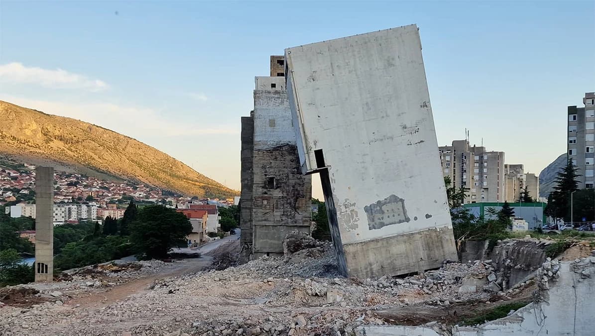 Nastavlja se rušenje ostataka nekadašnjeg mostarskog Žitoprometa. Rušenje kompleksa počelo je u rujnu 2017. godine uklanjanjem silosa, njih 24, što je potrajalo skoro godinu dana. (foto:bljesak.info)