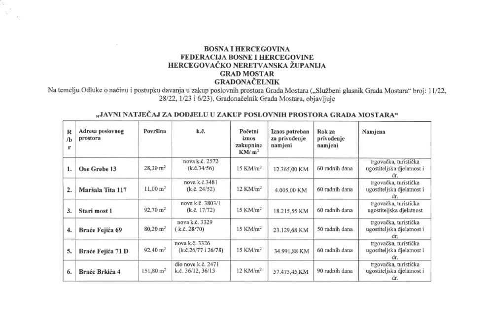 Grad Mostar raspisao je javni natječaj za zakup poslovnih prostora na više lokacija.