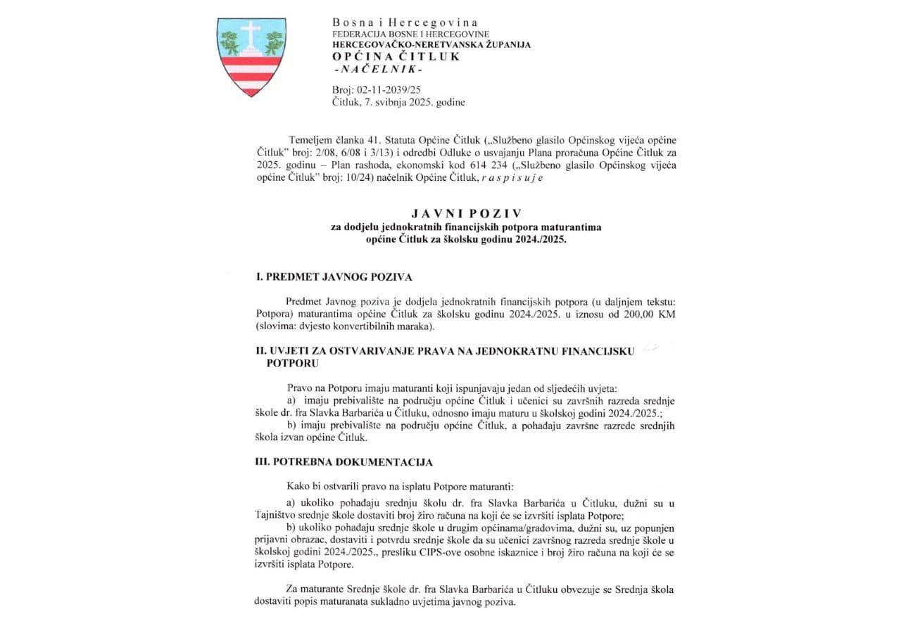 Javni poziv za maturante općine Čitluk