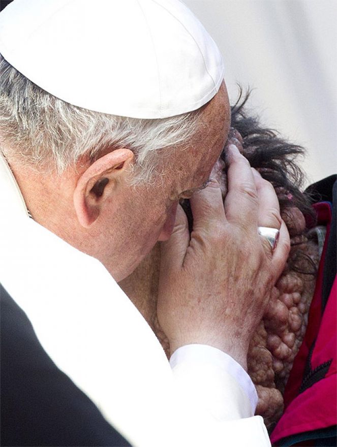 Papa Franjo prekinuo je opću audijenciju na Trgu sv. Petra u srijedu kako bi zagrlio i poljubio teško bolesnog čovjeka prekrivenog čirevima. Nastavio je moliti s njim i blagoslovio ga. Muškarac boluje od bolne neurofibromatoze, koja je genetska, a ne zarazna. Međutim, oboljele često društvo odbacuje zbog izgleda.