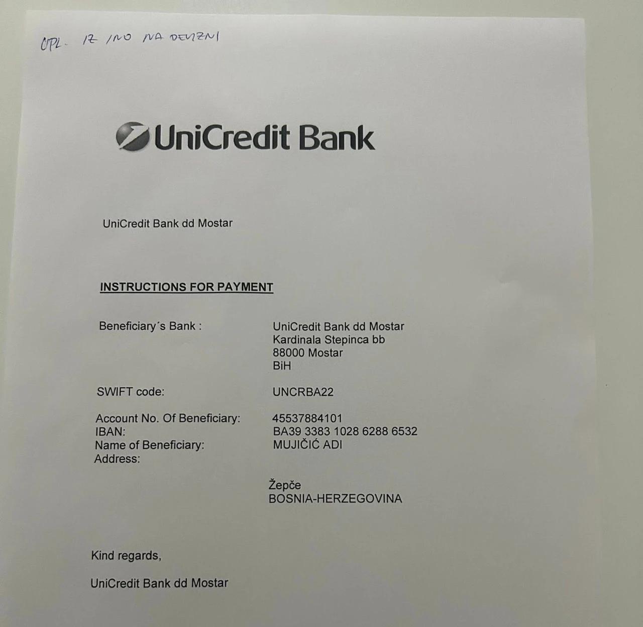 Foto: privatna arhiva / Račun za uplatu pomoći