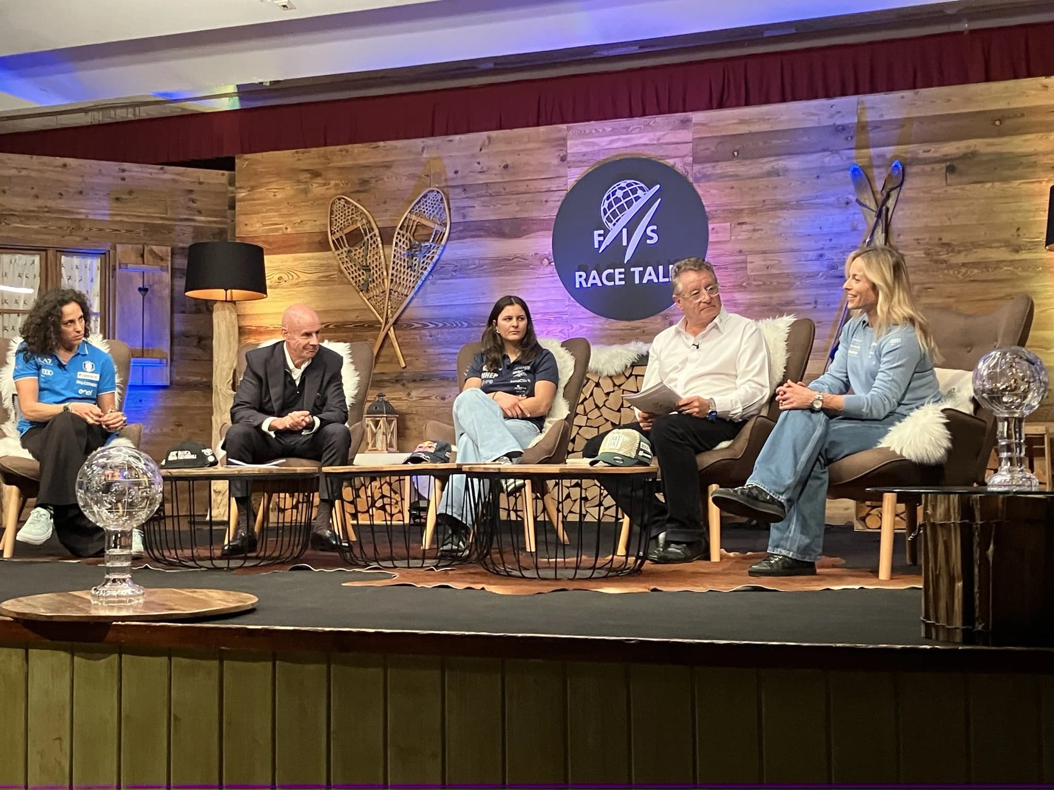 Lara Gut-Behrami, Federica Brignone i Zrinka Ljutić skupa s predsjednikom FIS-a Johanom Eliaschom na tribini uoči početka skijaške sezone