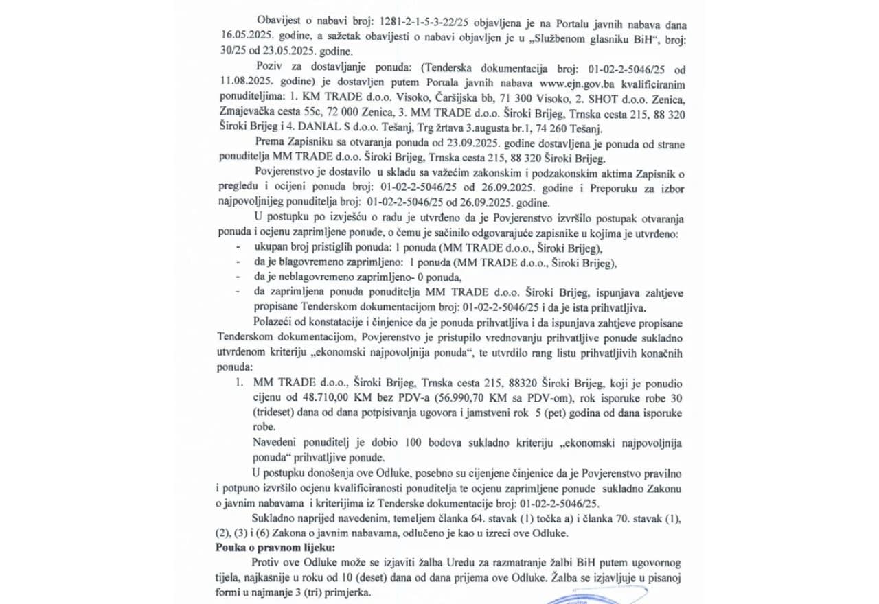 Foto: Screenshot / Nabava pištolja MUP-a HNŽ