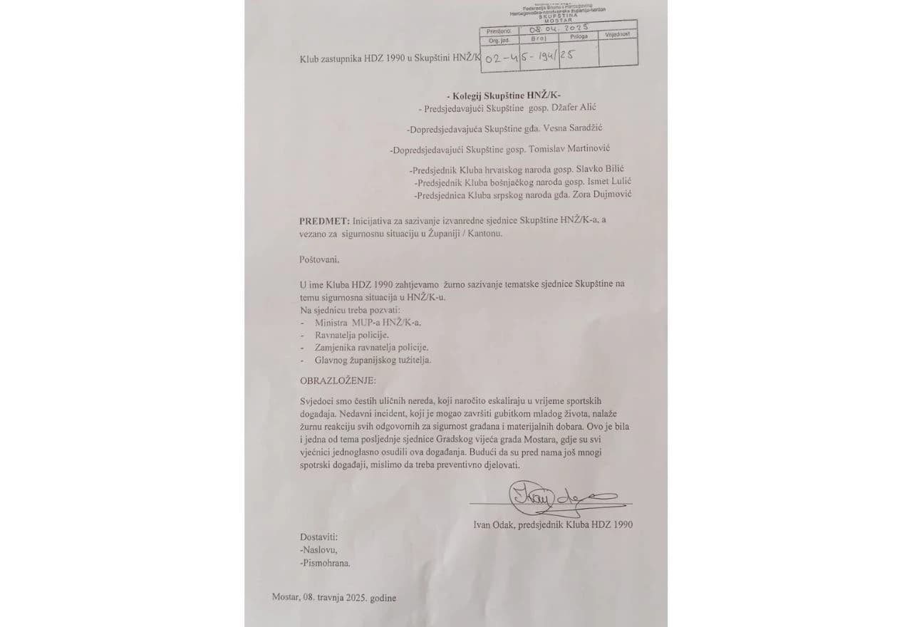 I HDZ 1990 traži hitnu sjednicu Skupštine HNŽ-a o sigurnosnoj situaciji u Mostaru